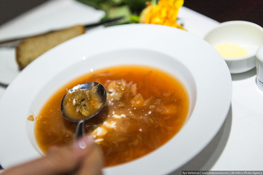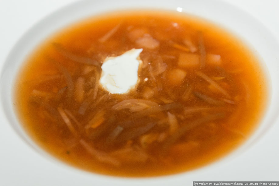 ロシア連邦のフラッグ・キャリア『アエロフロート・ロシア航空』モスクワ-ベトナム・ハノイ路線、ビジネスクラスで出された機内食を撮影した写真です。ソ連時代は「サービスが悪い」「機内食が美味しくない」「機材が古い」等、運賃が安い以外全てにおいて評判が悪く、この不安なイメージから現在もロシアの航空会社を敬遠する人も多く存在しますが、同航空会社ではソ連崩壊以降ボーイングやエアバスなど新鋭機に一新、安全性とサービスの改善に努めたことから利用者の顧客満足度が大幅に上昇、従来の悪評は払拭されています。写真ではロシア人向けの「ボルシチ」やロシア風クレープの「ブリヌイ」等も確認できます。モスクワ-ベトナム・ハノイ路線の運行機材はA330-200、片道約20万円程です。