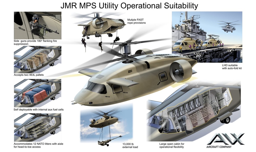 AVX エアクラフト・カンパニー社が提案する機体はOH-58Fをコンパウンド化するAVX修正技術を基本とし、二重反転式ローターと2基のダクテッド・ファンを組み合わせた複合ヘリコプターです。提案機体は最大時速236kt(約437km/h)、最大航続距離2,100海里(約3,890キロ)、外部負荷容量13,000 lbs (約5,900kg) と従来機と比較し高速性能と広い航続距離の獲得を目指します。機内キャビンには乗員4名、隊員14人が収容でき、荷役用大型リアのランプを備え463Lパレットを2個積載可能でミッションにより組み合わせることができます。ティルトローターと比べ整備コスト及びライフサイクルコストは大幅に低く、攻撃型バリエーションと共通性を持たせることで生産性も高いとしています。