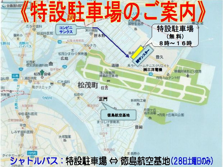 ※基地内に駐車場はありません。徳島阿波おどり空港横の特設駐車場(無料)をご利用ください。