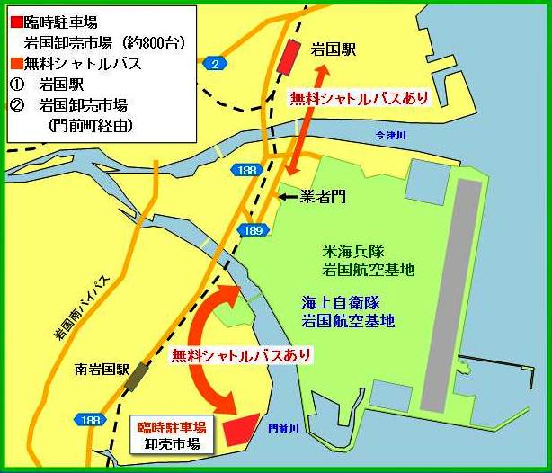 ※岩国錦帯橋空港の建設に伴い、車両の入門ゲートが狭くなっているため、混雑が予想されます。できるだけ、岩国駅から岩国航空基地に運行する無料バスをご利用ください。