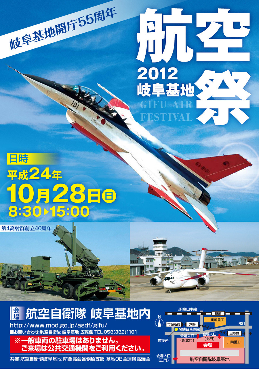岐阜基地は岐阜県各務原市那加官有地無番地に所在する航空自衛隊の基地です。空自が装備する航空機や各種装備品の開発・試験を担当する飛行開発実験団を擁している為、最新の機種や試験機を見ることができることもあり、航空ファンには人気の航空祭です。基地の特性上航空自衛隊が運用する機種の大部分が配備されていることもあり、同航空祭最大の名物である「異機種混合飛行」が見れるのは岐阜基地ならでは。撮影環境はメイン会場が北側になるため終日逆光ぎみですが、基地西側正門付近は順光で撮影ができ、滑走路から離着陸する迫力のある写真が撮れます。基地南側には「かがみはら航空宇宙科学博物館」が隣接しており、ここには珍しい実験機が展示してあるので時間があれば抑えておきたい場所です。