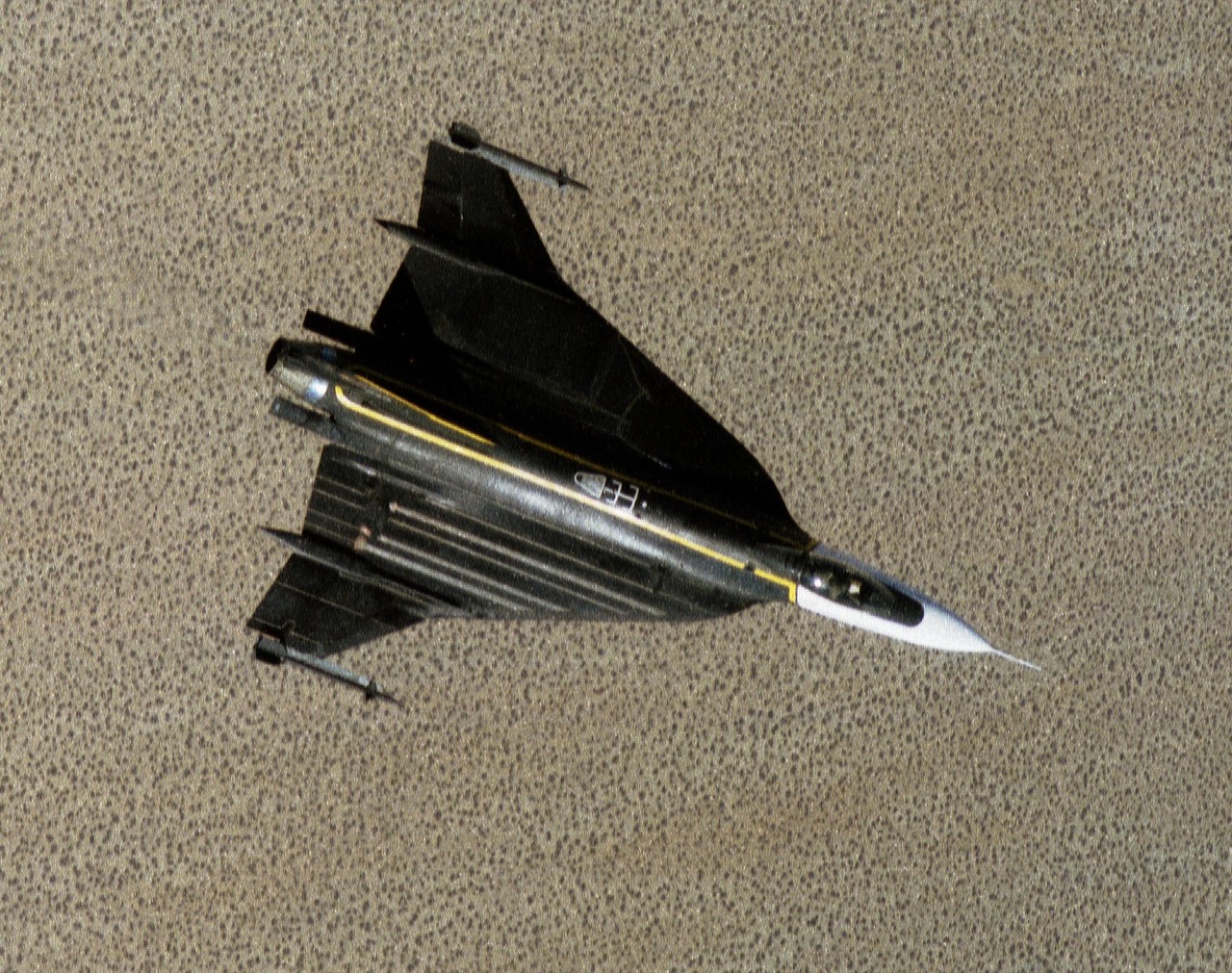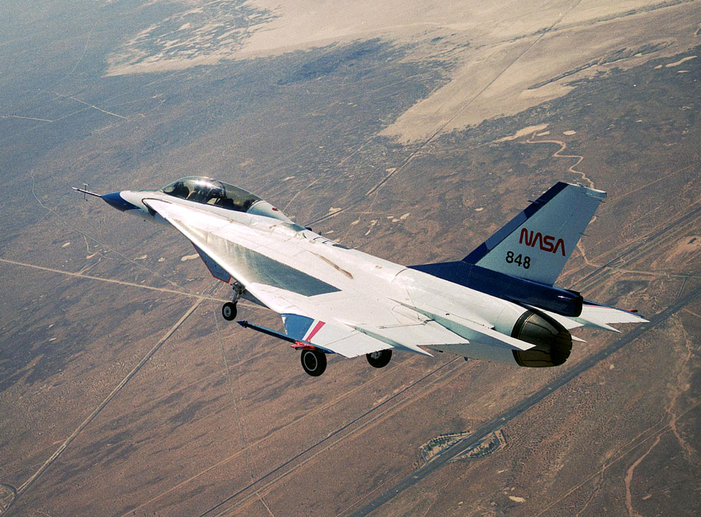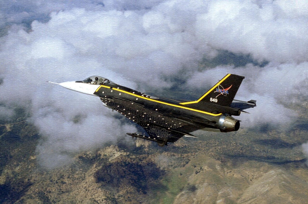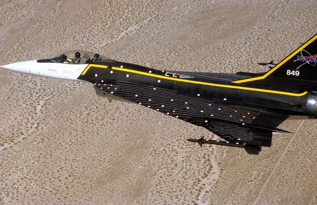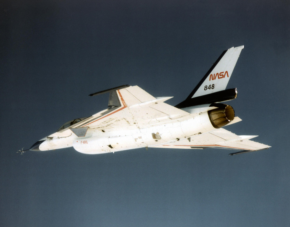 NASAがドライデン飛行研究センターで1988年より翼の形状や大きさによる超音速飛行時の層流制御研究に「F-16XL」を用いて各種実験を行っていた際の運用記録写真です。同機は大型戦闘爆撃機F-111の後継機としてマクドネル・ダグラス社のF-15Eと採用を競うも敗れ、選定終了後、2機の試作機はNASAに引き渡されました。1号機はクランクト・アロー・デルタ翼の境界層制御とソニックブーム、エンジンの騒音が主な課題となり、翼外板表面に小さな穴や溝を作ることで気流の流れを制御する実験に使用。2号機は移層流最大範囲の領域測定と騒音測定用に左翼のみにチタンとガラス繊維発泡体のグローブと呼ばれる翼板を追加したことで左右非対称の機体になっています。研究プログラムは1999年に終了しましたが2007年に米空軍のF-16(Block 40)で発見された改善点改修とアップグレードの費用調査の為1号機がロッキード・マーティン社に返還されテストを実施しています。現在は全機退役しエドワーズ空軍基地に保管されています。
