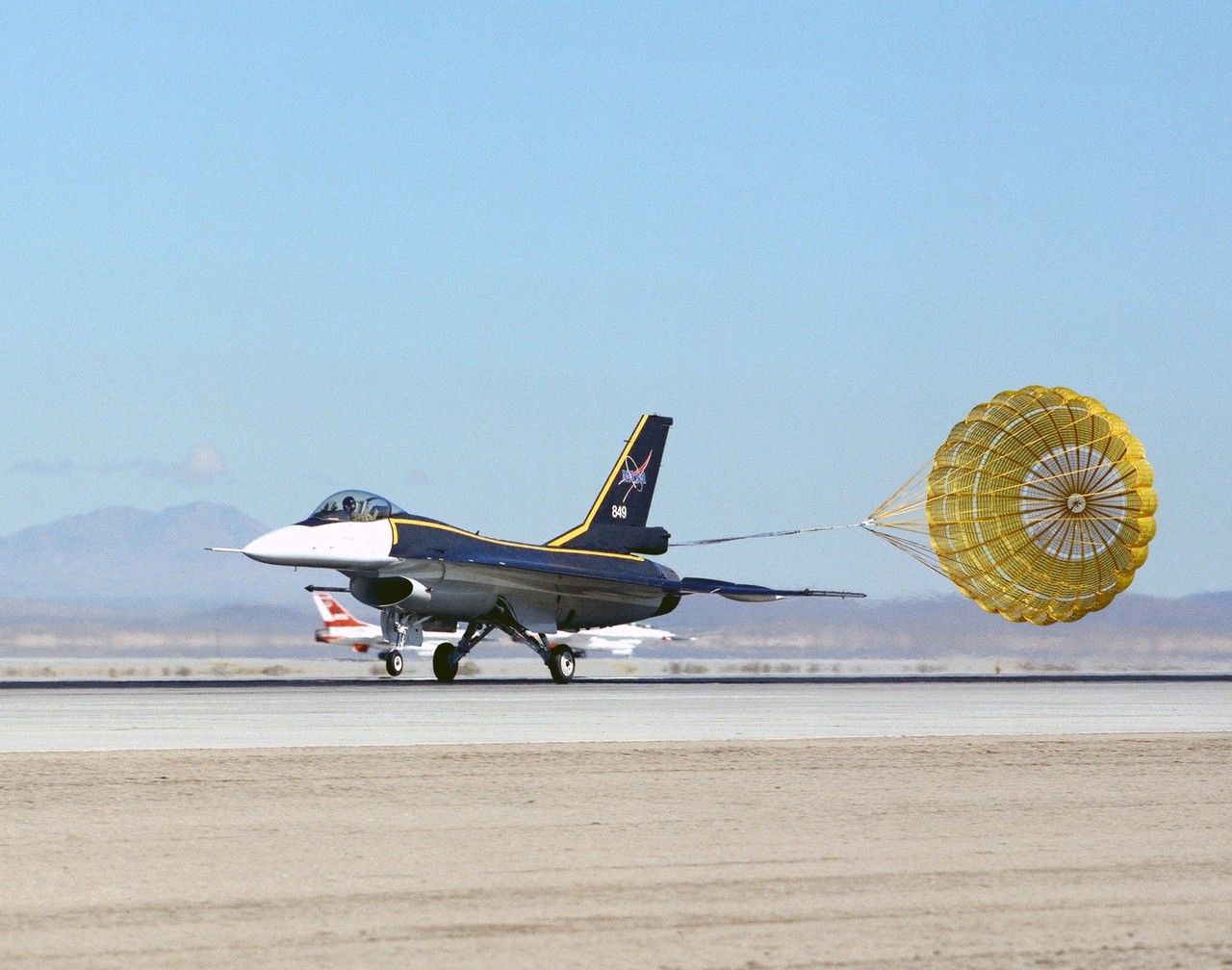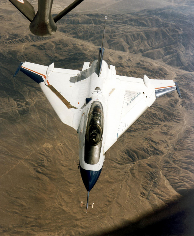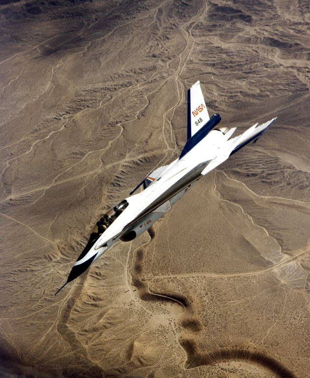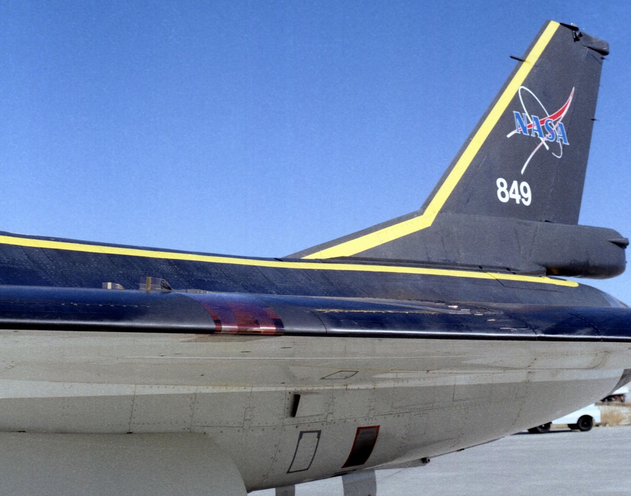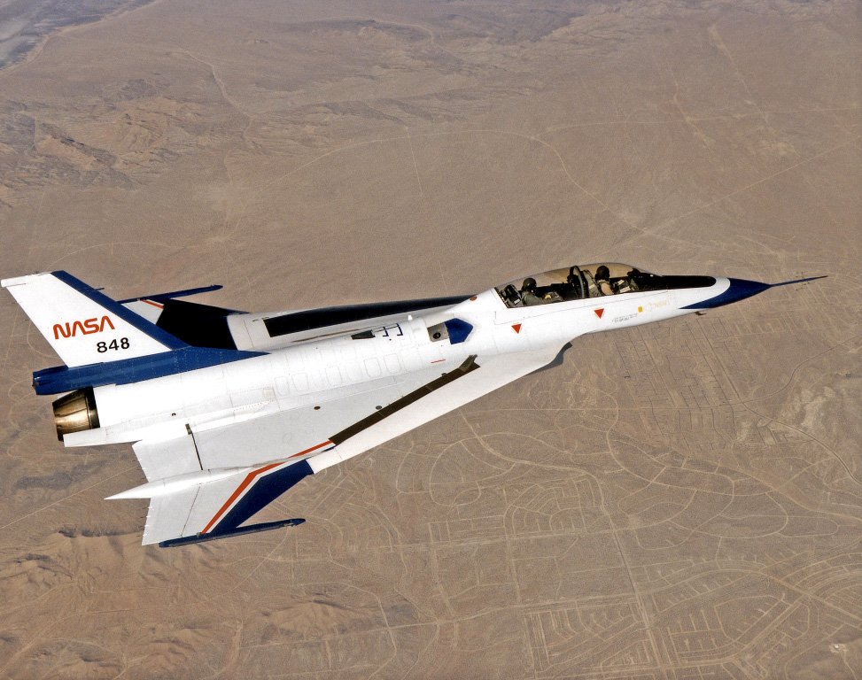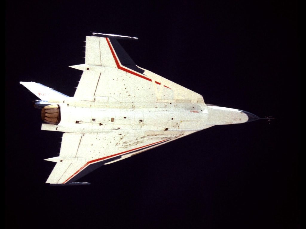 NASAがドライデン飛行研究センターで1988年より翼の形状や大きさによる超音速飛行時の層流制御研究に「F-16XL」を用いて各種実験を行っていた際の運用記録写真です。同機は大型戦闘爆撃機F-111の後継機としてマクドネル・ダグラス社のF-15Eと採用を競うも敗れ、選定終了後、2機の試作機はNASAに引き渡されました。1号機はクランクト・アロー・デルタ翼の境界層制御とソニックブーム、エンジンの騒音が主な課題となり、翼外板表面に小さな穴や溝を作ることで気流の流れを制御する実験に使用。2号機は移層流最大範囲の領域測定と騒音測定用に左翼のみにチタンとガラス繊維発泡体のグローブと呼ばれる翼板を追加したことで左右非対称の機体になっています。研究プログラムは1999年に終了しましたが2007年に米空軍のF-16(Block 40)で発見された改善点改修とアップグレードの費用調査の為1号機がロッキード・マーティン社に返還されテストを実施しています。現在は全機退役しエドワーズ空軍基地に保管されています。