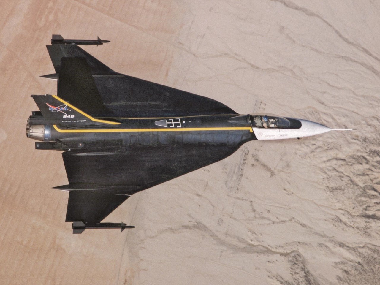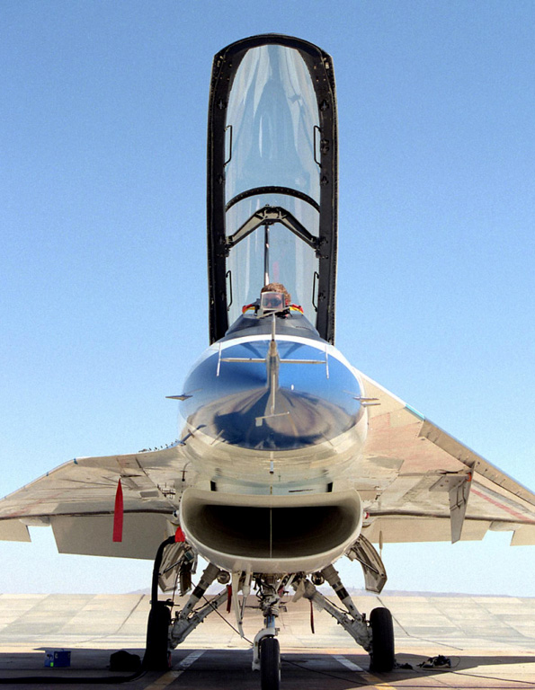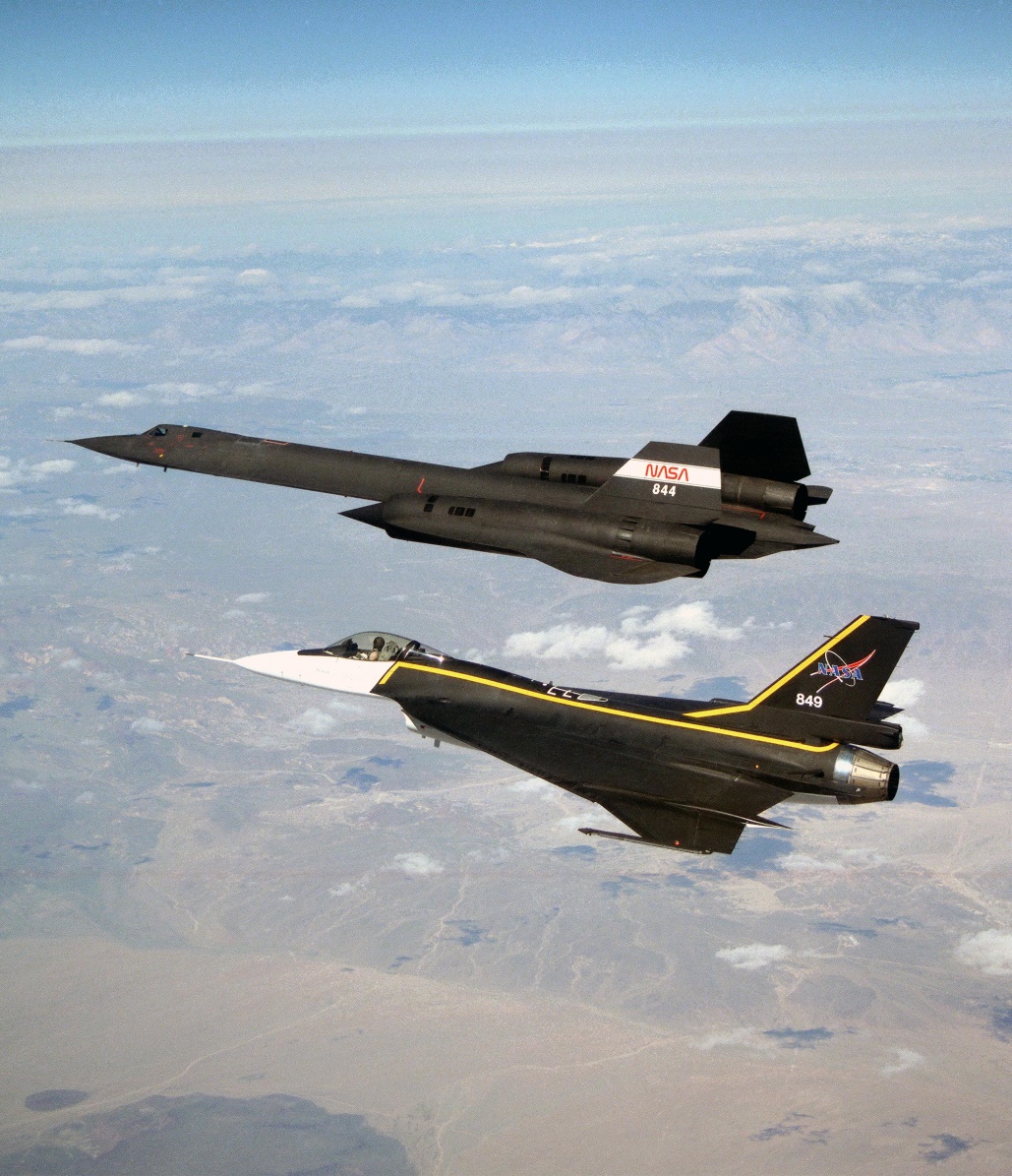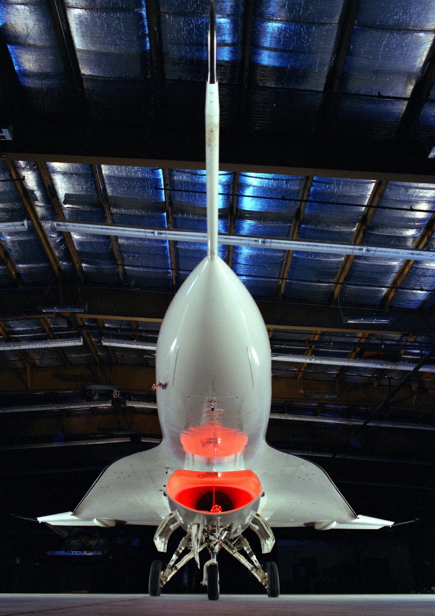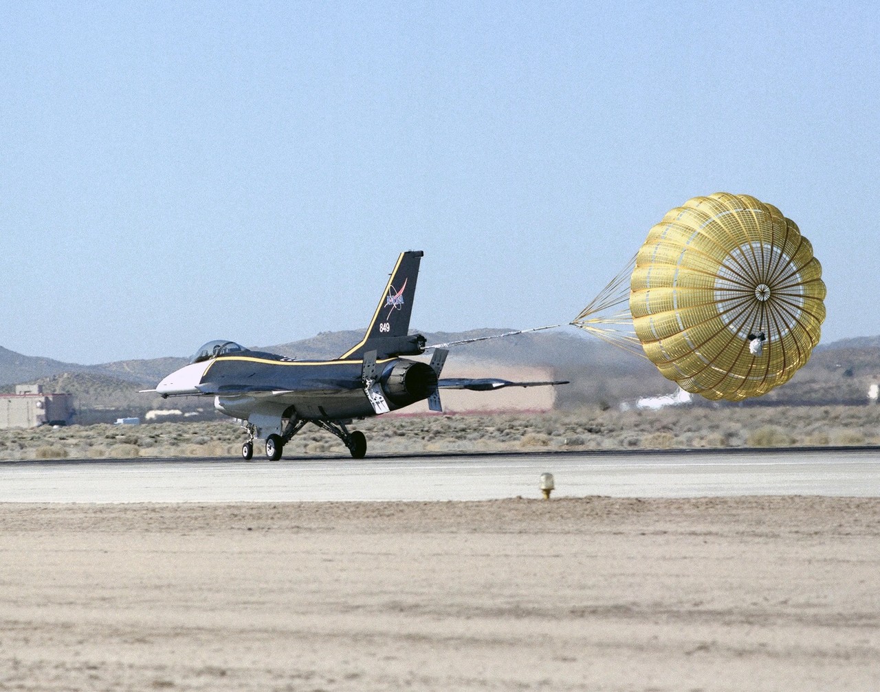 NASAがドライデン飛行研究センターで1988年より翼の形状や大きさによる超音速飛行時の層流制御研究に「F-16XL」を用いて各種実験を行っていた際の運用記録写真です。同機は大型戦闘爆撃機F-111の後継機としてマクドネル・ダグラス社のF-15Eと採用を競うも敗れ、選定終了後、2機の試作機はNASAに引き渡されました。1号機はクランクト・アロー・デルタ翼の境界層制御とソニックブーム、エンジンの騒音が主な課題となり、翼外板表面に小さな穴や溝を作ることで気流の流れを制御する実験に使用。2号機は移層流最大範囲の領域測定と騒音測定用に左翼のみにチタンとガラス繊維発泡体のグローブと呼ばれる翼板を追加したことで左右非対称の機体になっています。研究プログラムは1999年に終了しましたが2007年に米空軍のF-16(Block 40)で発見された改善点改修とアップグレードの費用調査の為1号機がロッキード・マーティン社に返還されテストを実施しています。現在は全機退役しエドワーズ空軍基地に保管されています。