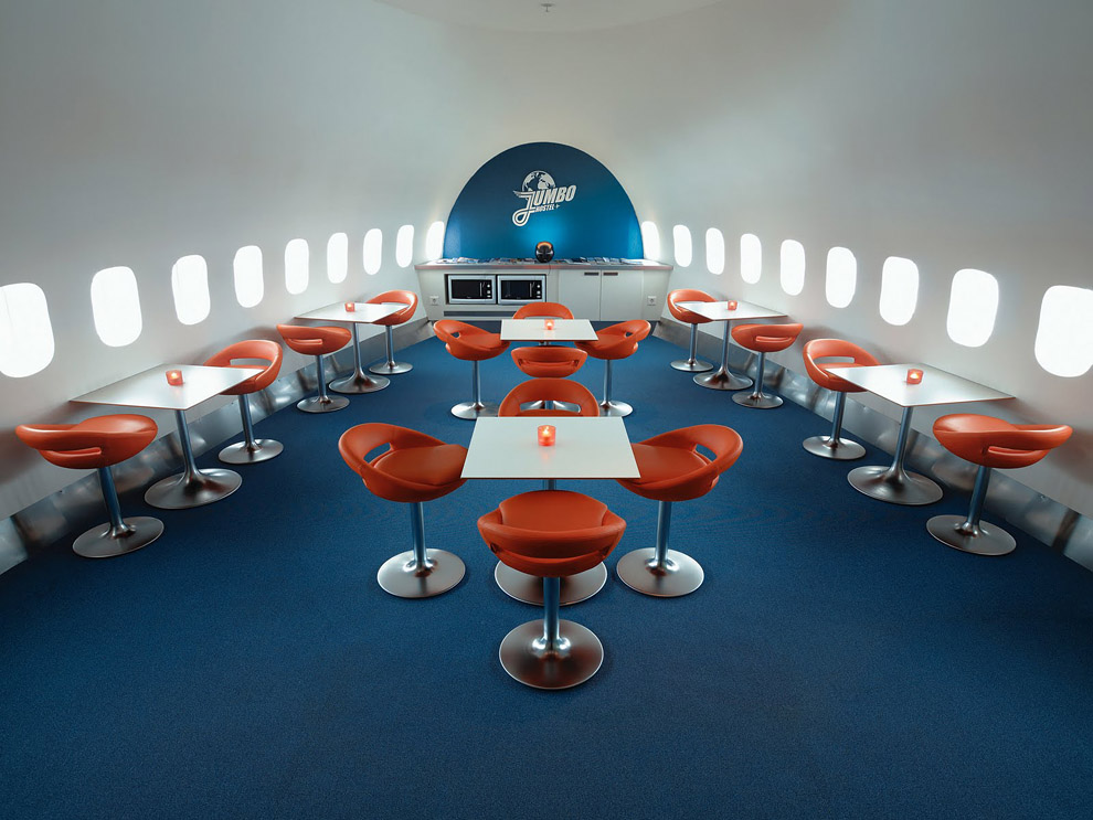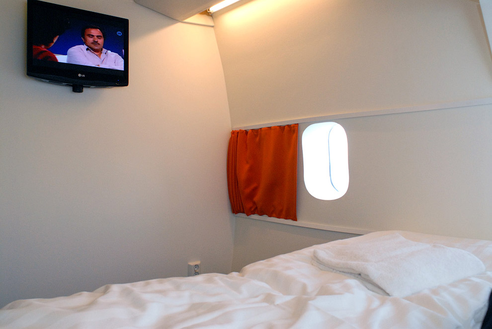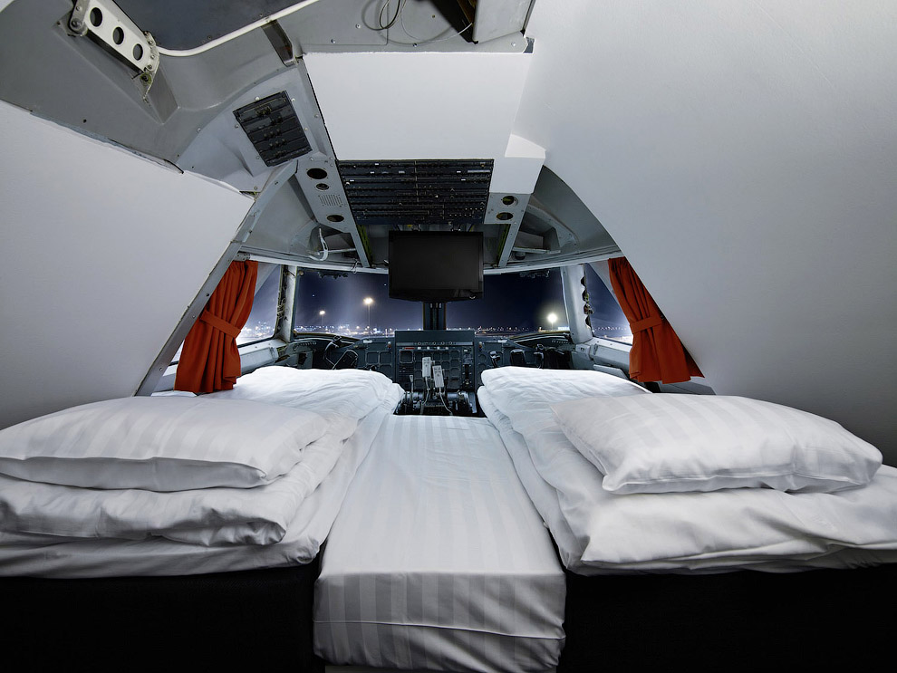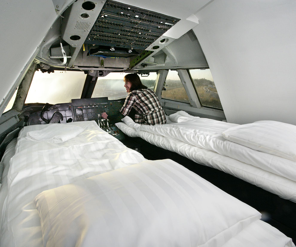 スウェーデンの首都郊外にある「ストックホルム・アーランダ国際空港」に本物のボーイング747大型旅客機(ジャンボジェット)を改造し世界初のユースホステルとした「ジャンボ・ホステル(Jumbo Hostel)」の写真です。このホステルの原型機である747-200型機は1976年にシンガポール航空用に製造され、今は無き米国のパンナム、スウェーデンのトランスジェット航空の旅客機として世界中を飛び回りました。最終的に放棄され解体されることになっていましたが、同国の企業家オスカー・ディオス氏が買い取り、2年の大改造の末2009年1月にホステルとして開業しています。機内は相部屋と個室に分かれており、コックピットのスイートルーム1部屋を含む25室、ベッド数は全部で74台でバスルームは専用または共用。1階にはドリンクや機内食を楽しめるお洒落なカフェバーもあり、味気ない普通のホテルに泊まるより楽しめて思い出に残る場所になるかもしれません。