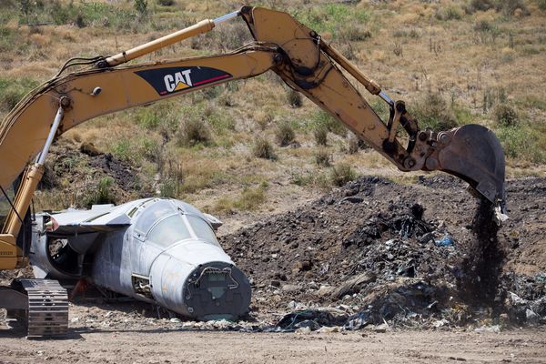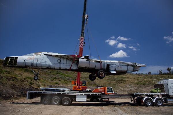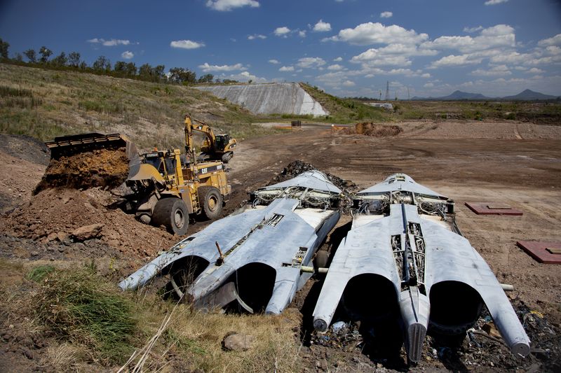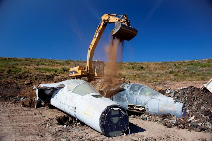 2010年12月に全機退役したオーストラリア空軍の可変翼戦闘爆撃機『F-111C(アードバーク)』の埋立て最終処分場風景を撮影した写真です。F-111の胴体部分に現在では世界的に禁止されているアスベストが断熱材として使用されており、解体する工程で大量に飛散することが予想され、高額なコストを掛け分解するより廃棄物として埋め立てることが経済性が高いと政府は判断。博物館や軍施設に展示される機体以外23機が主翼・エンジン・部品を外された状態で2011年11月、クイーンズランド州イプスウィッチ郊外のスワンバンク処分場に埋立てられました。展示機体についてもアスベスト飛散処理と管理を満たす環境を整える等基準を設けており、アメリカ空軍から中古で購入したF-111G型は国際条約に基づく武器取引規則により米国政府の承認の元、廃棄・保存等の情報は一般公開はされないことになっています。